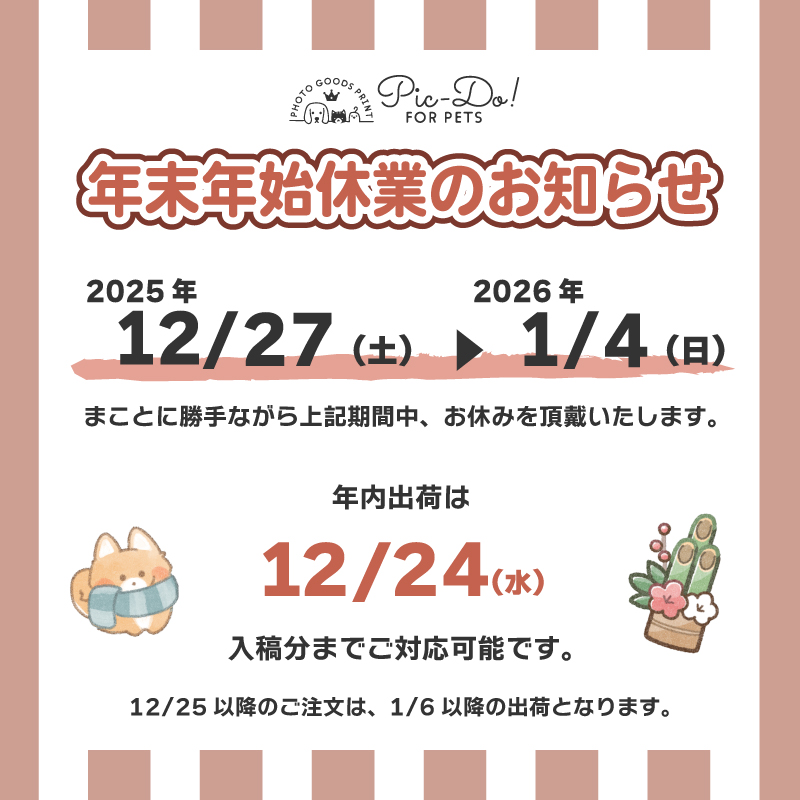 休業明けは、2026年1月5日(月)午前10時より順次ご対応させていただきますが、ご注文やお問い合わせが多く寄せられた場合、ご対応が通常より遅れる場合がございます。