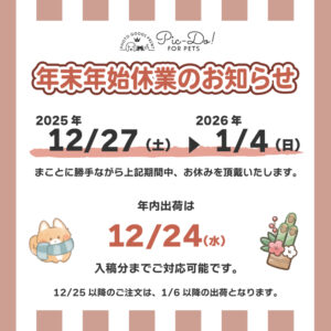 いつもご利用いただきまして誠にありがとうございます。 誠に勝手ながら、2025年12月27日(土)~2026年1月4日(日)の期間を年末年始の休業日とさせていただきます。 年内の発送をご希望のお客様は、2025年12月2 […]